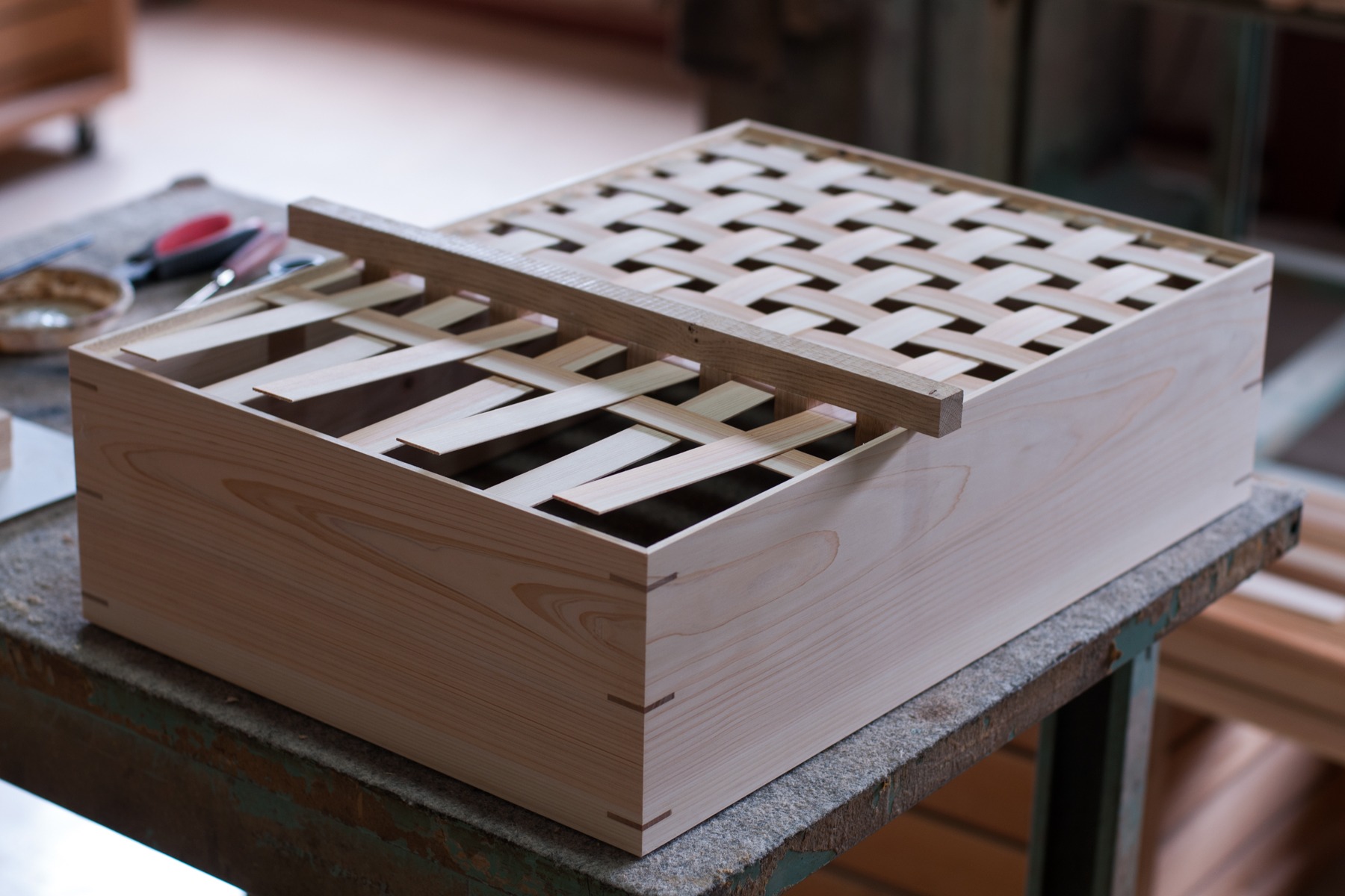 吉永製作所は、調温・調湿ができる野菜ケースを地元長崎産の檜で製作。動力は使わない素朴な木箱です。当然、機能面では冷蔵ショーケースには敵いませんが、プラスチックフィルムで包まなくとも、多少野菜が萎れてもなお映える良い箱が出来たと思います。「これでいいのだ。」と、思って貰えると嬉しいです。