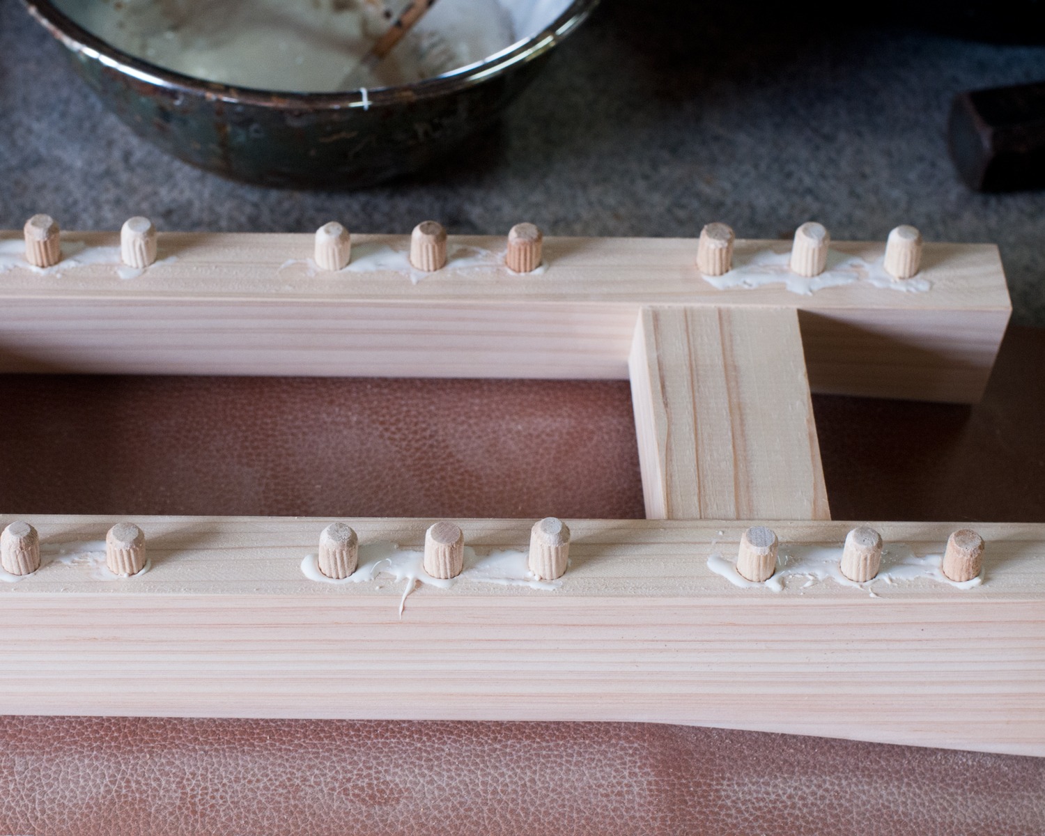 接着剤を塗布すると、ダボは接着剤の水分を吸収します。すると、ダボ穴の中で元の大きさに戻り、しっかりと嵌合します。少しでも楽して作りたいし、丈夫な物に仕上げたい。一挙両得の手段です。
