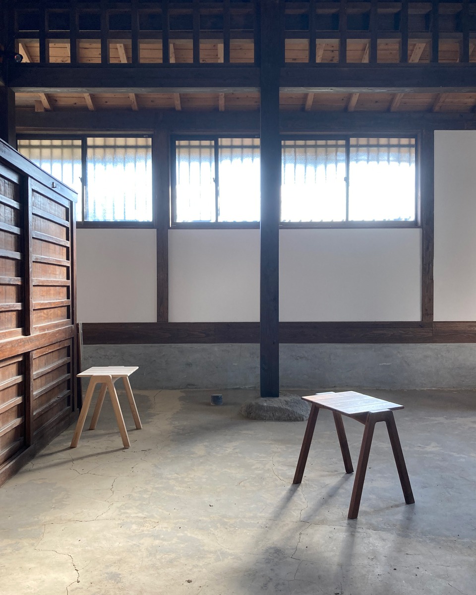 DENKEN WEEKでは、茅葺き屋根の武家屋敷永松邸の土間にてMINAZUKI STOOLを展示します。3つの樹種20脚ほどを展示します。同じデザインでも、樹種はもちろん木目の揺らぎで印象が違いますので、実際にご覧頂ければと思います。
