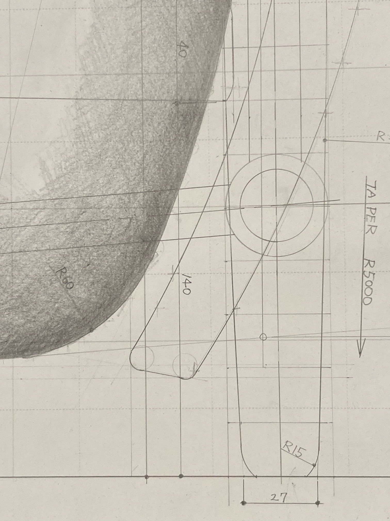 手描きの椅子の現寸図。CADで作図するよりスケール感が把握できて理解しやすいです。そして楽しい。
