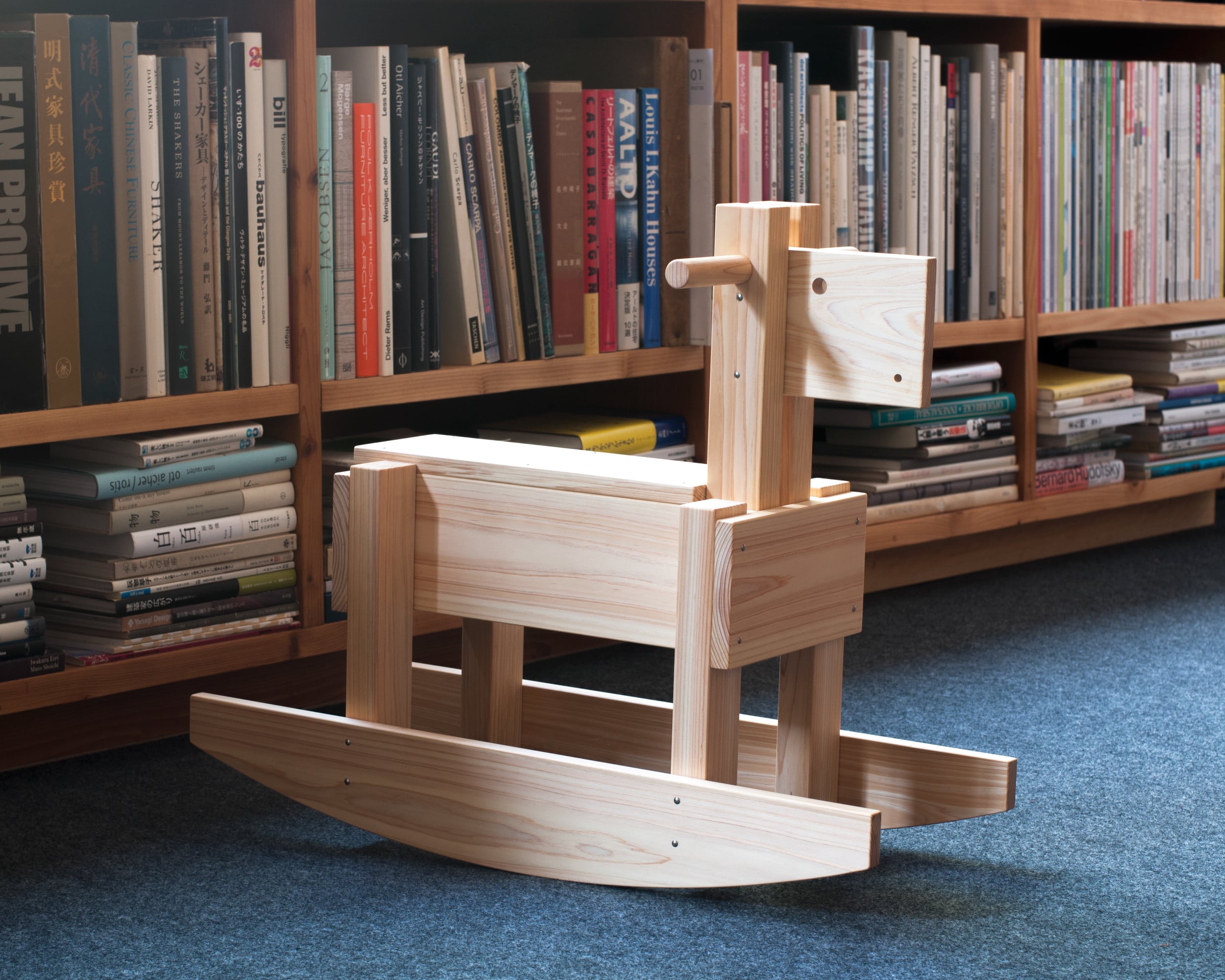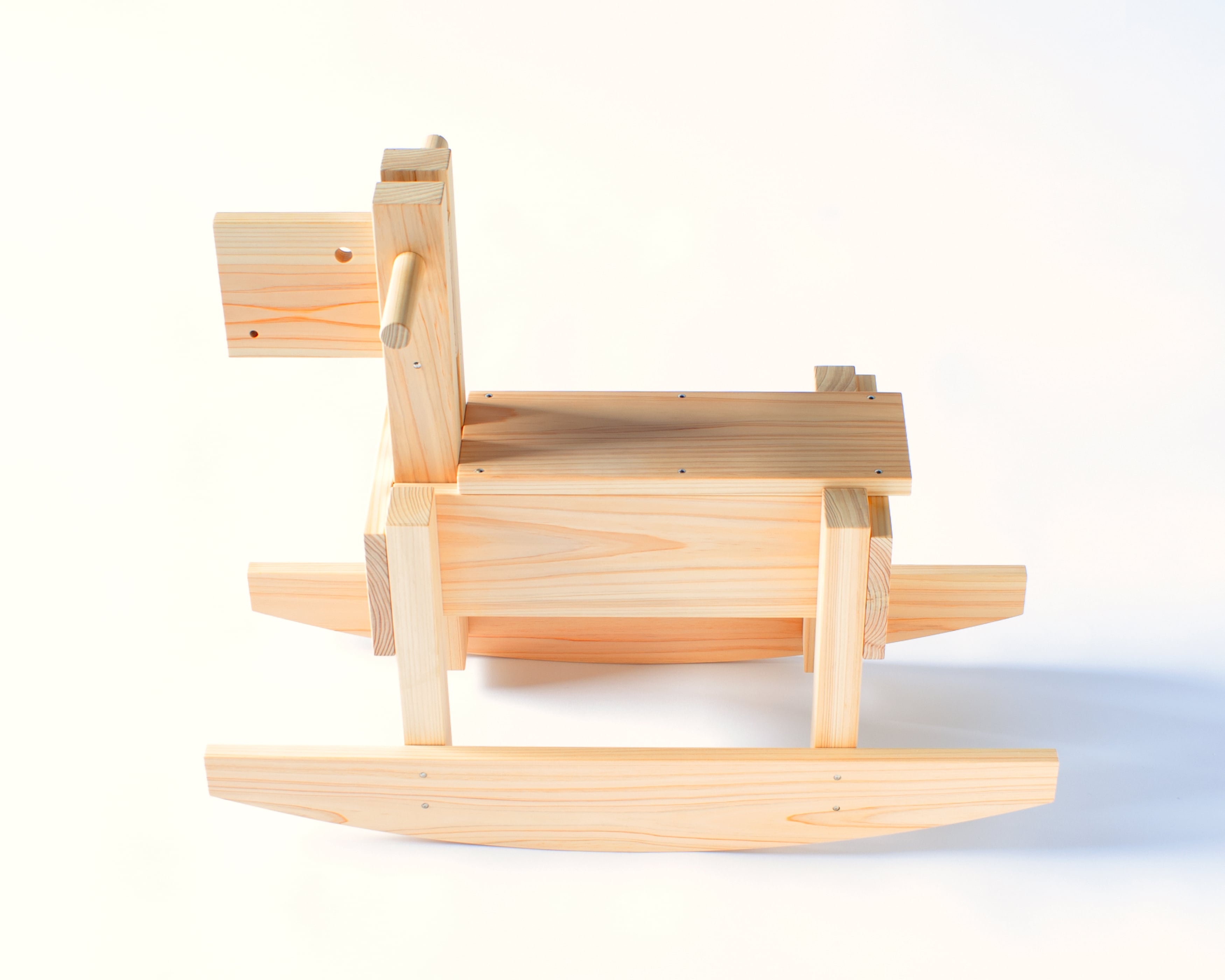 娘のために作った木馬です。素朴なフォルムと愛らしい佇まいに仕上がりました。ハイハイからつかまり立ちができるようになった娘が、ゆらゆら木馬で遊ぶ姿を見ていると、前後に体重移動する感覚や、全身の筋肉の使い方が自然と身についているようで、成長しているなあ…、と感慨深くなります。素材は長崎産ヒノキ、仕上げはミツロウワックスです。ヒノキはやわらかく、ミツロウワックスは自然由来なので安心してお使いいただけます。