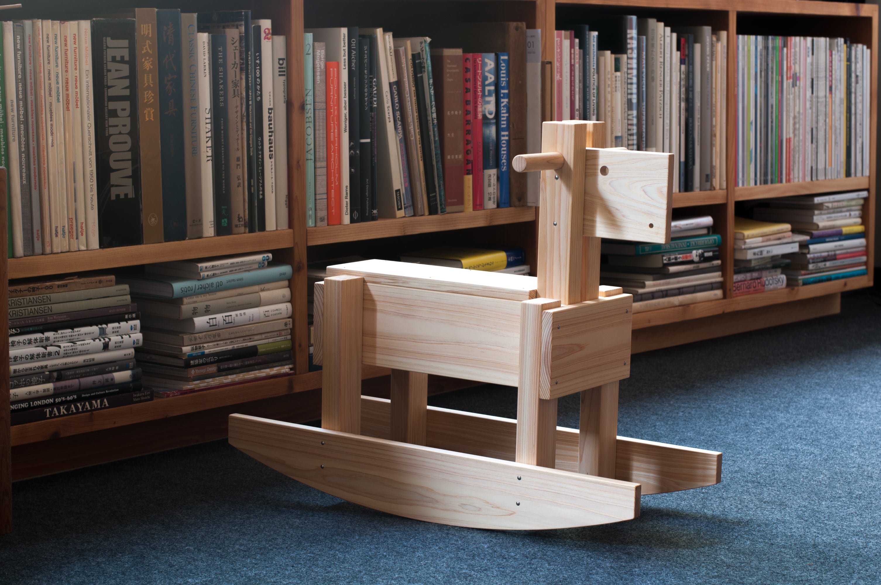 乳幼児期のこどもの成長はめまぐるしい。何か作ってあげたいと思い悩んでいるうちにすぐに手遅れになってしまいます。素早く考え、手早く作るためにはどうしたらよいか?あれこれ試案する中で、Enzo Mariさんのautoprogettazione?をお手本にしました。身近にある木材と釘だけで誰でも作ることができる一連の家具デザインです。この木馬に使用した材は30×45㎜の野縁、15×105㎜の野地板と呼ばれている、ホームセンターなどでも手に入る規格材です。制作にあたっては、工房で丸太から仕入れている長崎産ヒノキを同サイズに製材して使用しています。