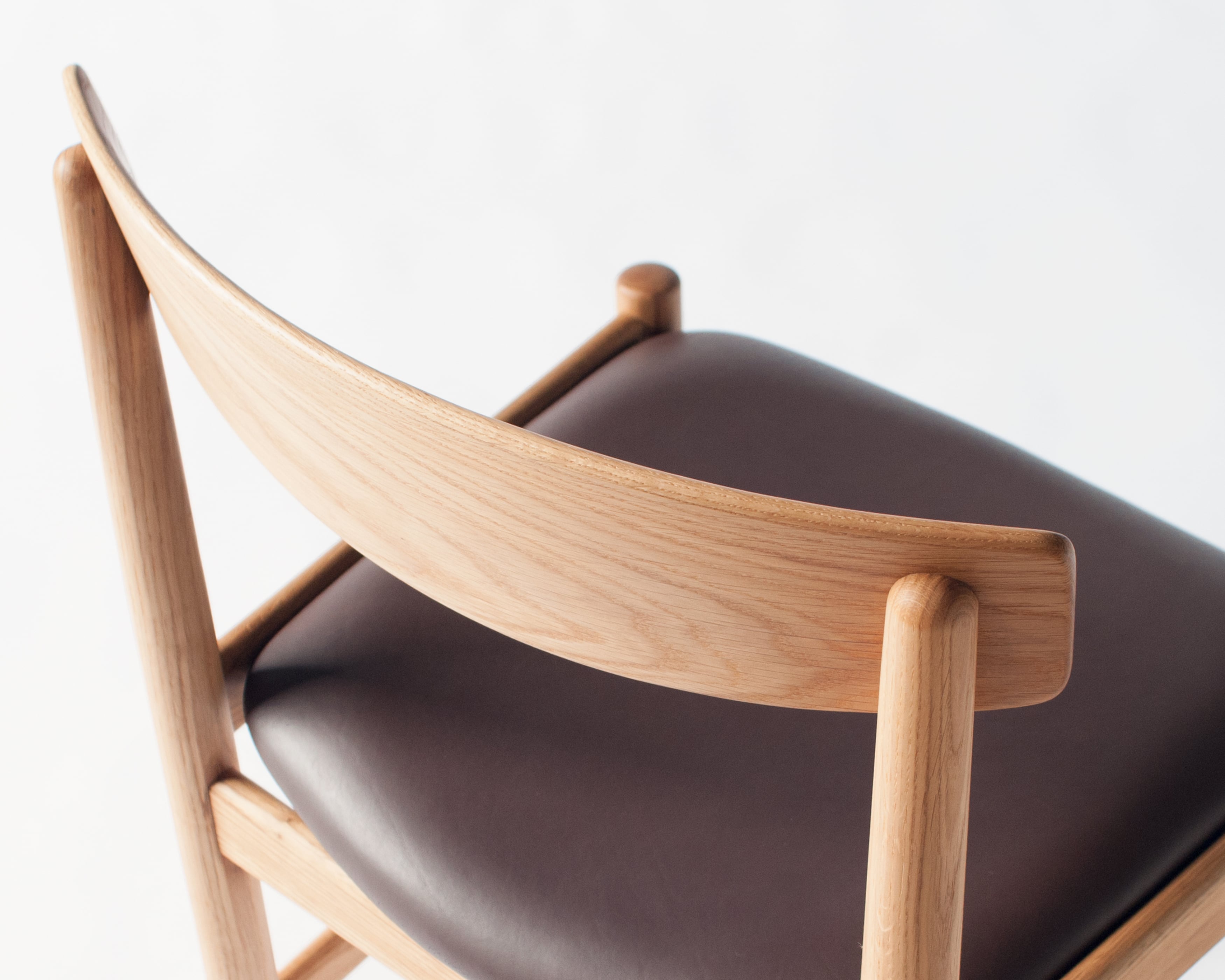 「わたしの身体に合う終(つい)の椅子を作ってください。」とご依頼を受けたのがきっかけで生まれた椅子です。より多くの人の日常に馴染んでいく普遍的な「わたしの椅子」を目指して作りました。幅広の三次元曲面の背当てが食事の姿勢を優しくサポートしてくれます。後脚の前に背当てが付いているので、斜に崩した姿勢でも背当てが滑らかに追従してくれます。材料の調達から仕上げまでを外部委託することなく、手仕事と機械加工を行き来しながらアトリエで一貫制作しています。