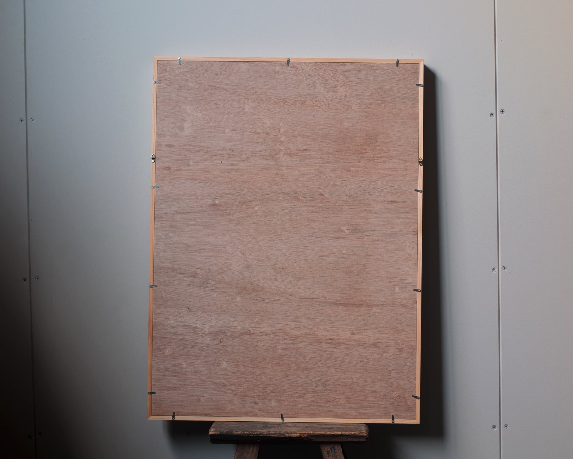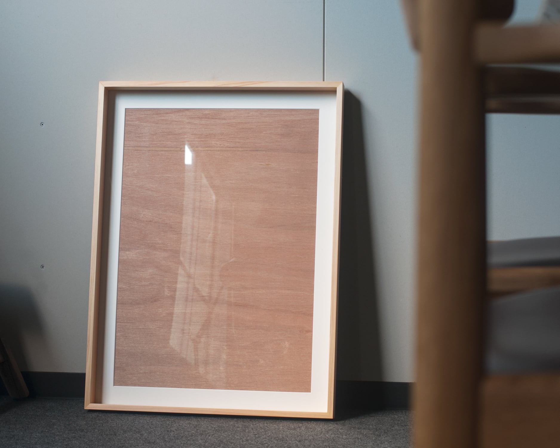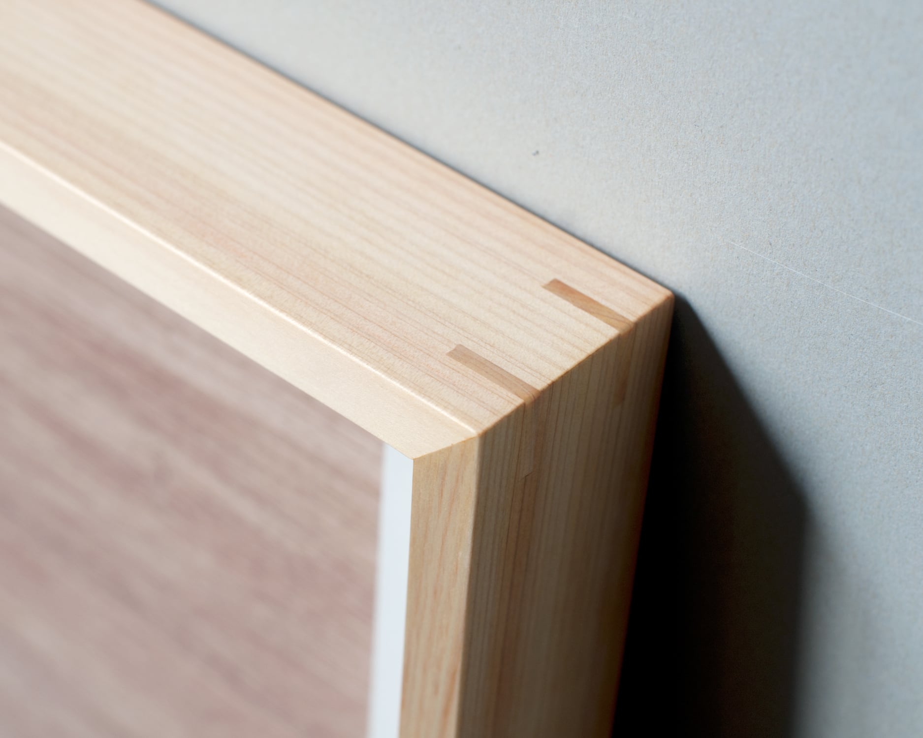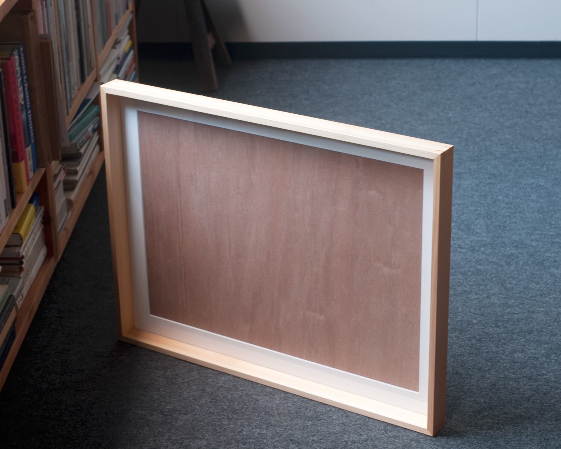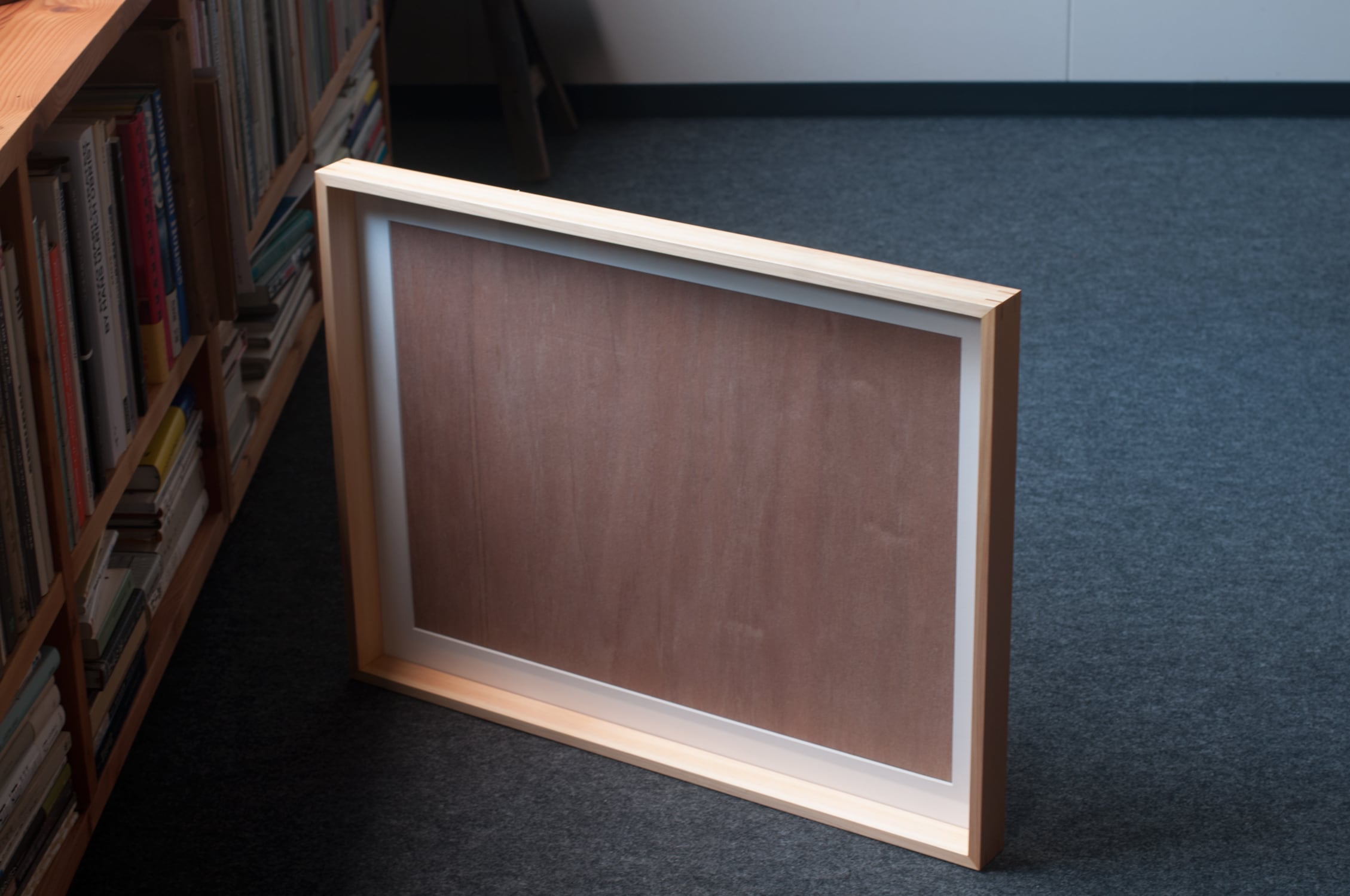 ヒノキの柾目材を使ったフレームです。直線的な柾目は端正な表情なので飾る作品を引き立ててくれます。正面は薄く奥行が深い板状のフレームは、輪郭に独特の陰影を作ります。壁に掛けると窓枠のような、床に置くと家具を配したような存在感が特徴です。マット紙の窓寸はA2サイズに対応しています。